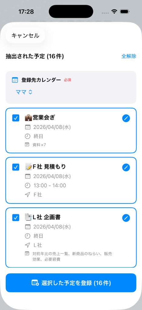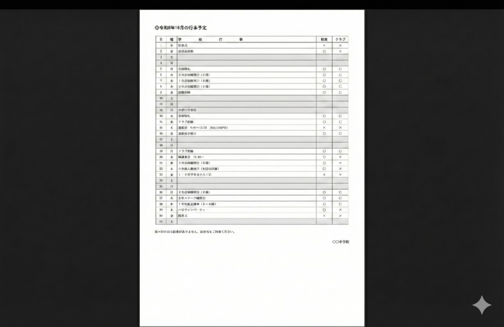 AIが手書き文字、表形式、月間カレンダー、様々な予定形式を読み取ります。1枚から多数の予定を抽出可能です。 AI reads handwriting, tables, monthly calendars, and various schedule formats. You can extract many events from a single image.