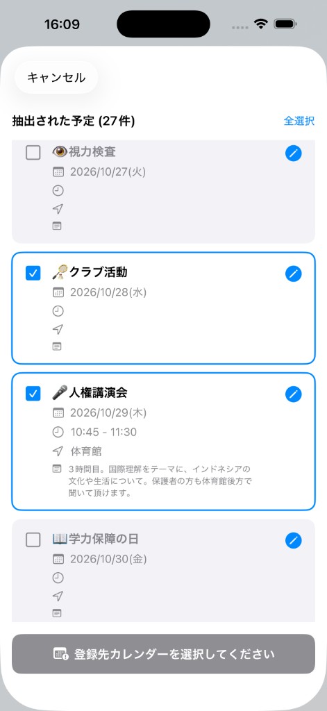 一部の予定だけが欲しいのに。。なんて時は、「運動会関連の予定だけ」など追加の依頼をカスタマイズ欄に記載すれば、AIがあなたの依頼に答えて、抽出結果をカスタマイズします。 When you only want some of the events, add instructions like “Only sports day events” in the customize field and the AI will tailor the extraction results to your request.